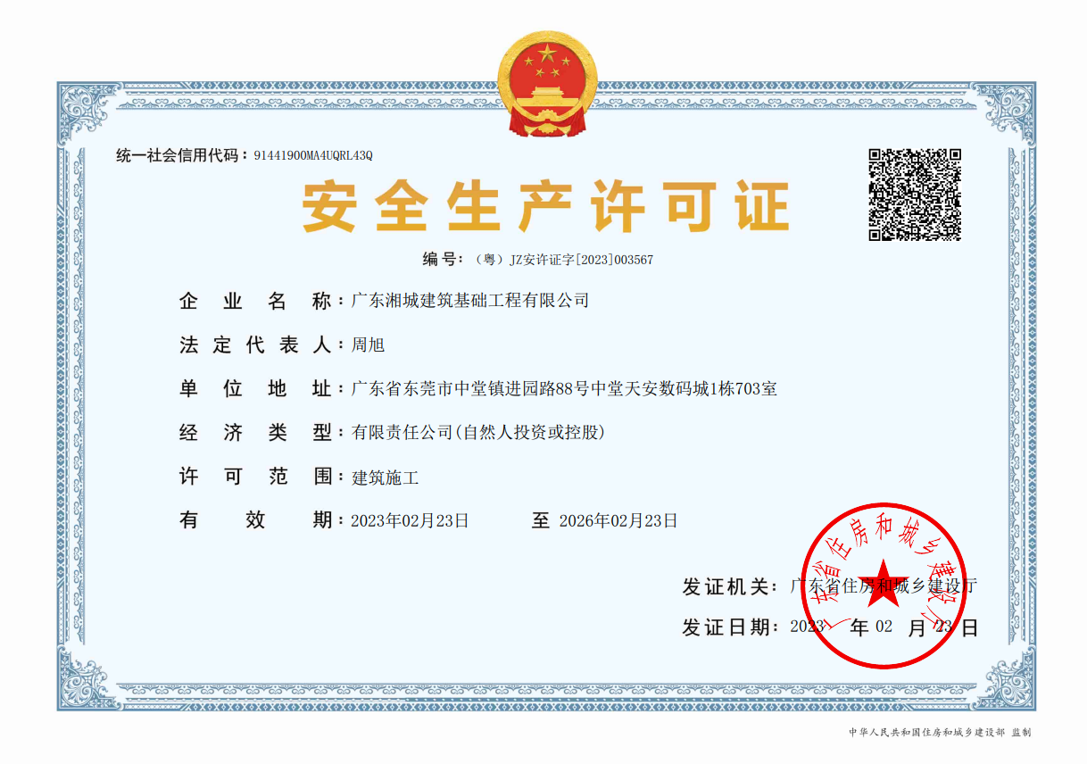 廣東湘城建筑基礎(chǔ)工程有限公司,成立于2016年,注冊(cè)資金4888萬(wàn)元,持有地基基礎(chǔ)工程專業(yè)承包壹級(jí)資質(zhì),具有安全生產(chǎn)許可證。可承接各種基礎(chǔ)類施工,包括各類樁基礎(chǔ)、基坑支護(hù)、邊坡支護(hù)、地基強(qiáng)夯處理等施工業(yè)務(wù)。公司為地基與基礎(chǔ)工程專業(yè)承包、工程施工、技術(shù)咨詢、技術(shù)開(kāi)發(fā)、技術(shù)服務(wù)、信息咨詢實(shí)體型企業(yè)。